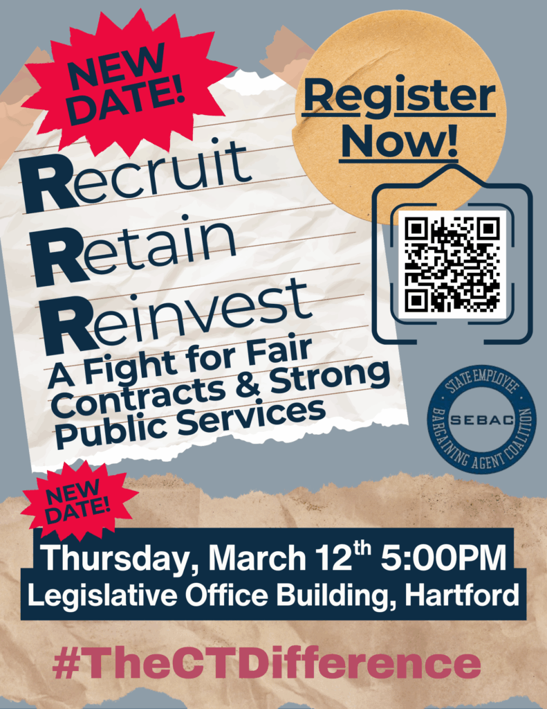 The event is being organized by the State Employees Bargaining Agent Coalition (SEBAC), which includes AFT Connecticut and 11 of our affiliated unions and chapters.